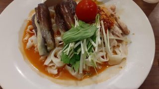 今日のランチ。 石庫門の蒸し鶏と茄子の冷製マーラー刀削麺。 久しぶりの刀削麺。うまー✨